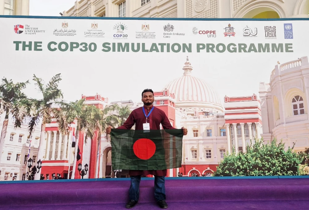 Md. Shariful Islam, Student of the Department of Information Technology & Management, DIU represented BANGLADESH at the the 𝐂𝐎𝐏𝟑𝟎 𝐒𝐢𝐦𝐮𝐥𝐚𝐭𝐢𝐨𝐧 𝐅𝐞𝐥𝐥𝐨𝐰𝐬𝐡𝐢𝐩 𝐏𝐫𝐨𝐠𝐫𝐚𝐦𝐦𝐞 𝟐𝟎𝟐𝟓 from October 2 to 9 hosted by The British University in Cairo, Egypt in partnership with UNDP Egypt.